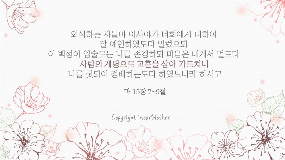 하나님의 계명을 지키지 않는 자들은 사람이 만든 불법인 사람의 계명을 지키고 있습니다. 사람의 계명을 지키는 것은 예수님을 헛되이 경배하는 것이라고 하셨습니다. 일요일이나 12월 25일을 기념하는 사람들도 '나도 구원받았다, 하나님의 백성이다'라고 하지만 그렇게 말한다고 해서 구원받는 것이 아니라 구원주시는 하나님께서 참된 믿음이라고 인정하는 자가 구원받을 수 있는 것 아닐까요? 따라서 사람의 계명을 지키는 사람은 결코 구원의 길로 나아갈 수 없습니다.