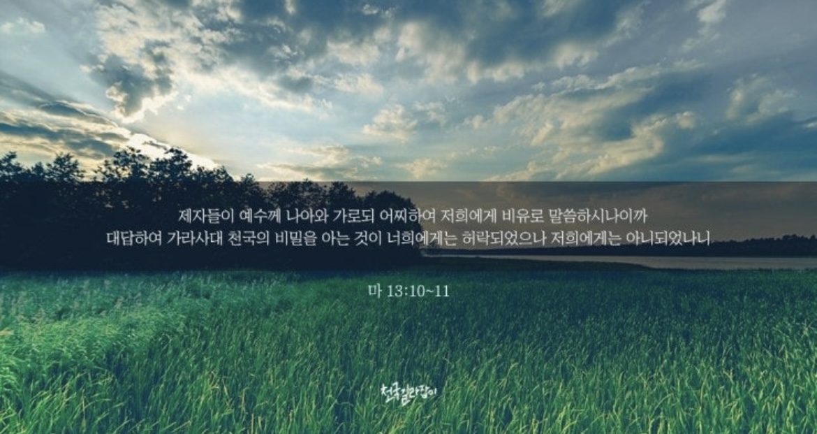 ... 천국의 비밀을 아는 것이 너희에게는 허락되었으나 저희에게는 아니되었나니 ... 저희가 보아도 보지 못하며 들어도 듣지 못하며 깨닫지 못함이니라 ... 그러나 너희 눈은 봄으로, 너희 귀는 들음으로 복이 있도다 마태복음 13장 10-17절