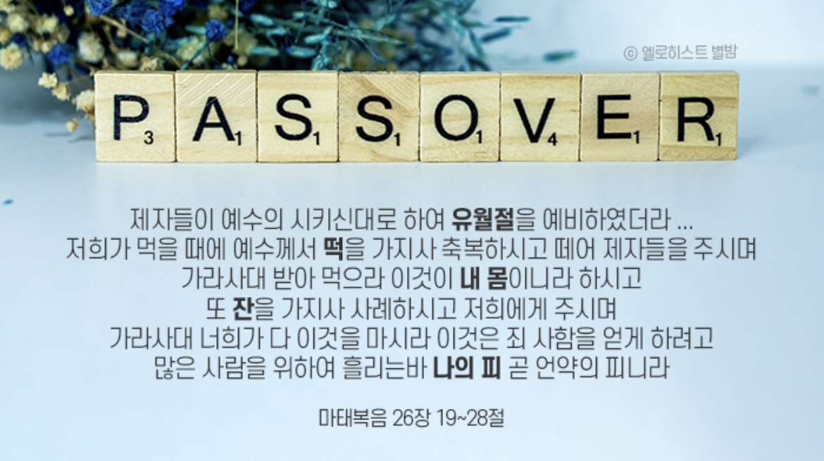 제자들이 예수의 시키신대로 하여 유월절을 예비하였더라 ... 저희가 먹을 때에 예수께서 떡을 가지사 .. 내 몸이니라 하시고 또 잔(포도주)을 가지사 ... 나의 피 곧 언약의 피니라 마태복음 26장 19-28절