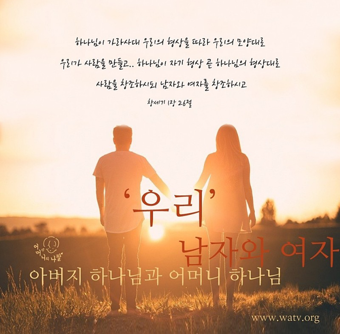'우리'라는 하나님의 형상 그대로 사람을 창조한 결과 누가 창조되었습니까? 남자와 여자입니다. 이는 하나님의 형상이 원본이요, 남자와 여자는 하나님의 형상 그대로 창조된 복사본이라 할 수 있는데요. 따라서 '우리'라는 하나님의 형상과 모양 그대로 사람을 창조했을 때 남자와 여자가 창조되었다는 것은 하나님안에 남성적 형상의 하나님과 더불어 여성적 형상의 하나님이 존재하신다는 뜻입니다.