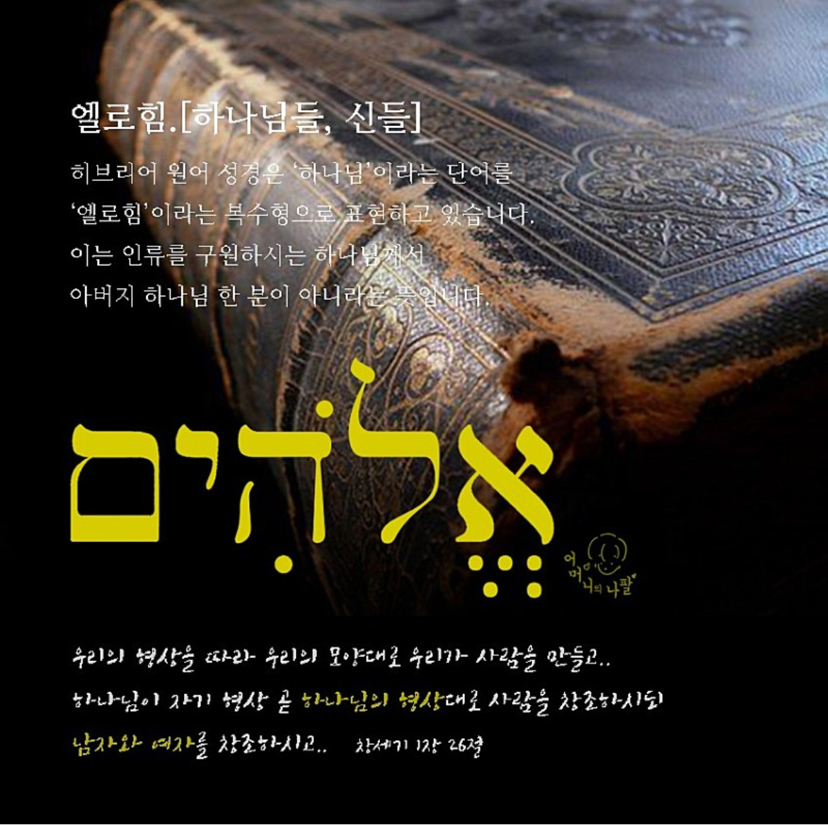 히브리어 원어 성경은 '하나님'이라는 단어를 '엘로힘'이라는 복수형으로 표현하고 있습니다. 원래 '하나님'을 뜻하는 단수형은 '엘' 또는 '엘로아흐'라 하는데 이 단어의 복수형이 바로 '하나님들, 신들'이라는 뜻의 '엘로힘'입니다. 한국어 성경에서는 '하나님'이라는 단수형태로 번역했기에 하나님 한 분 만을 생각하기 쉽지만, 원어 성경대로 번역한다면 '하나님들'이라는 표현이 맞는 표현인 것입니다.