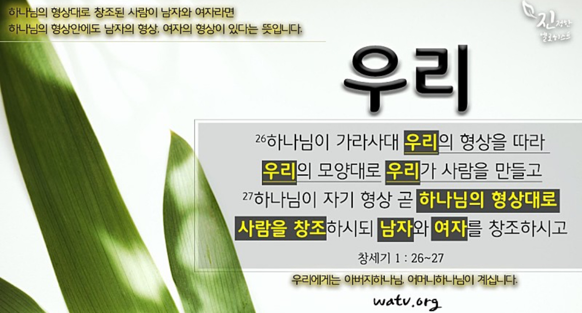 하나님께서는 스스로를 '나'라는 단수가 아닌 '우리'라는 복수로 표현하셨습니다. 이유가 무엇일까요? '우리'라는 하나님의 형상과 모양대로 사람을 창조하니 남자와 여자가 창조되었습니다. 이는 남성적 형상의 하나님과 여성적 형상의 하나님이 존재하심을 뜻합니다. 수천년동안 우리는 남성적 형상의 하나님을 아버지 하나님이라 불러 왔습니다. 그렇다면 여성적 형상의 하나님을 어떻게 불러야 할까요? 바로 어머니 하나님입니다.