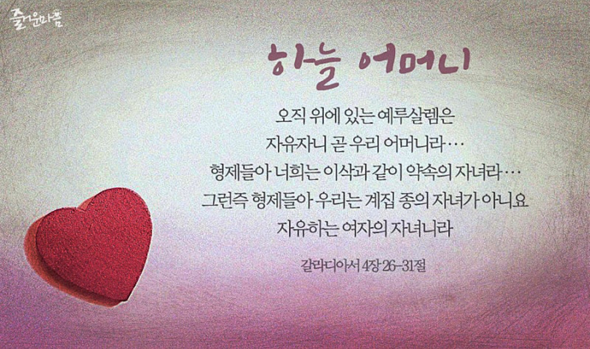 [갈라디아서 4장 26-31절] 오직 위에 있는 예루살렘은 자유자니 곧 우리 어머니라 ... 형제들아 너희는 이삭과 같이 약속의 자녀라 ... 자유하는 여자의 자녀니라